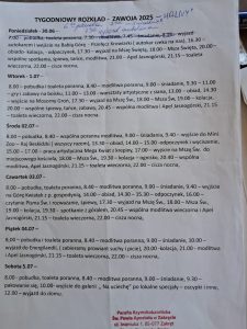 W dniu odpustu parafialnego, po zaśpiewaniu koncertu uwielbieniowego, grupa 82 osób wraz z opiekunami, wyjechała na wypoczynek letni do Zawoi – najdłuższej wsi polskiej. Najmłodszy uczestnik miał 2.5 roku, a najstarszy 62 lata. Na grupę czekało mnóstwo atrakcji. Każdego dnia coś nowego. Mieszkaliśmy w dwóch pięknych ośrodkach” Halny” i „Słoneczko”. Zwiedziliśmy ciekawe miejsca, zdobyliśmy Babią Górę, przemierzaliśmy górskie szlaki, robiliśmy dwie prace artystyczne ( zwierzaczek z siana i mega kwiat z włoskiej krepiny). Poznawaliśmy też zwyczaje góralskie, pieśni i legendy na spotkaniu z miejscowymi góralami. Sprawności fizyczne rozwijaliśmy na miejscowymi boisku. Wielkie oblężenie miał ostatniego dnia sklep z miejscowymi pamiątkami i góralskimi specjałami. Wreszcie największa atrakcja – ENERGILANDIA. Swoim zachowaniem i zaangażowaniem na koloniach, dzieci zapracowywały na wyjazd do miasteczka rozrywki.